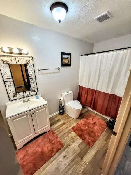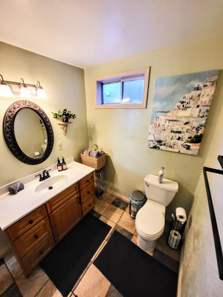 The main bathroom has a shower and a large vanity.