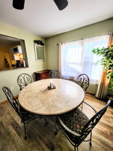 The dining room has seating for up to six.